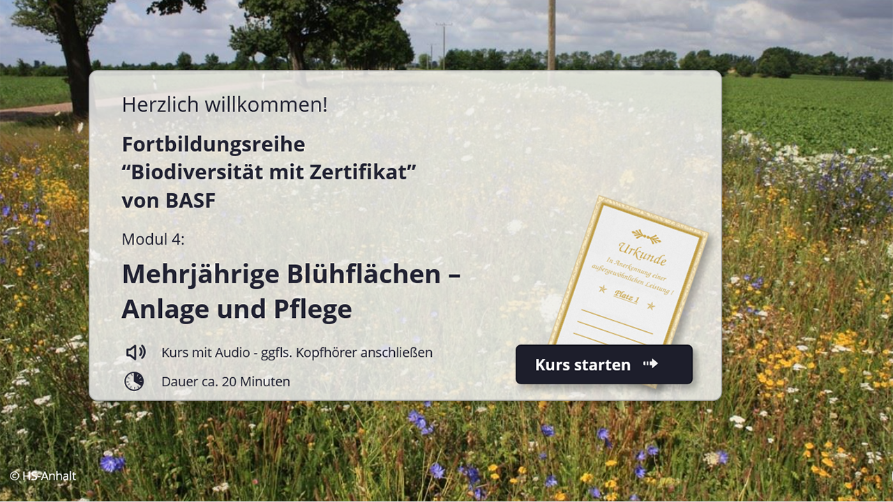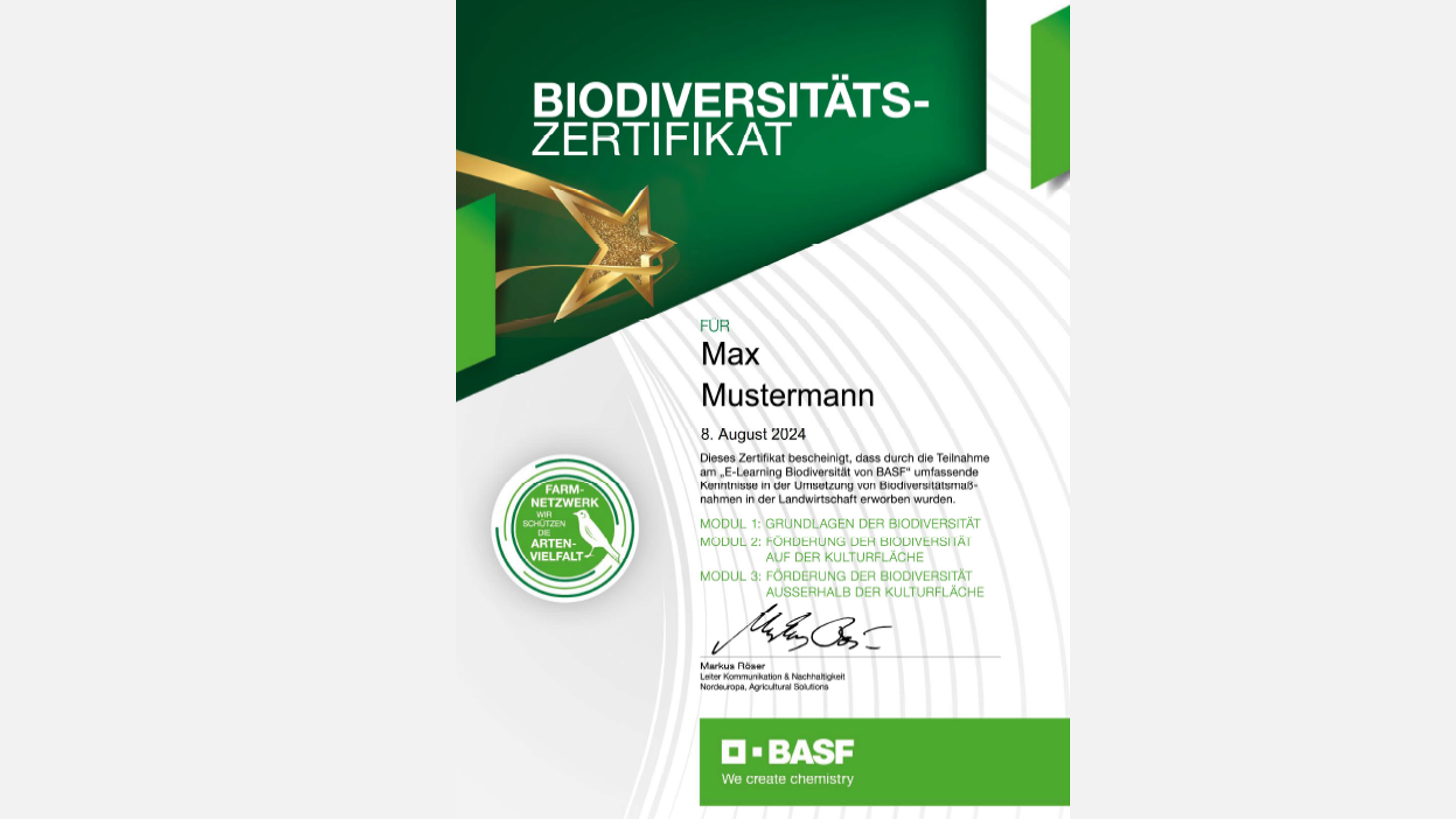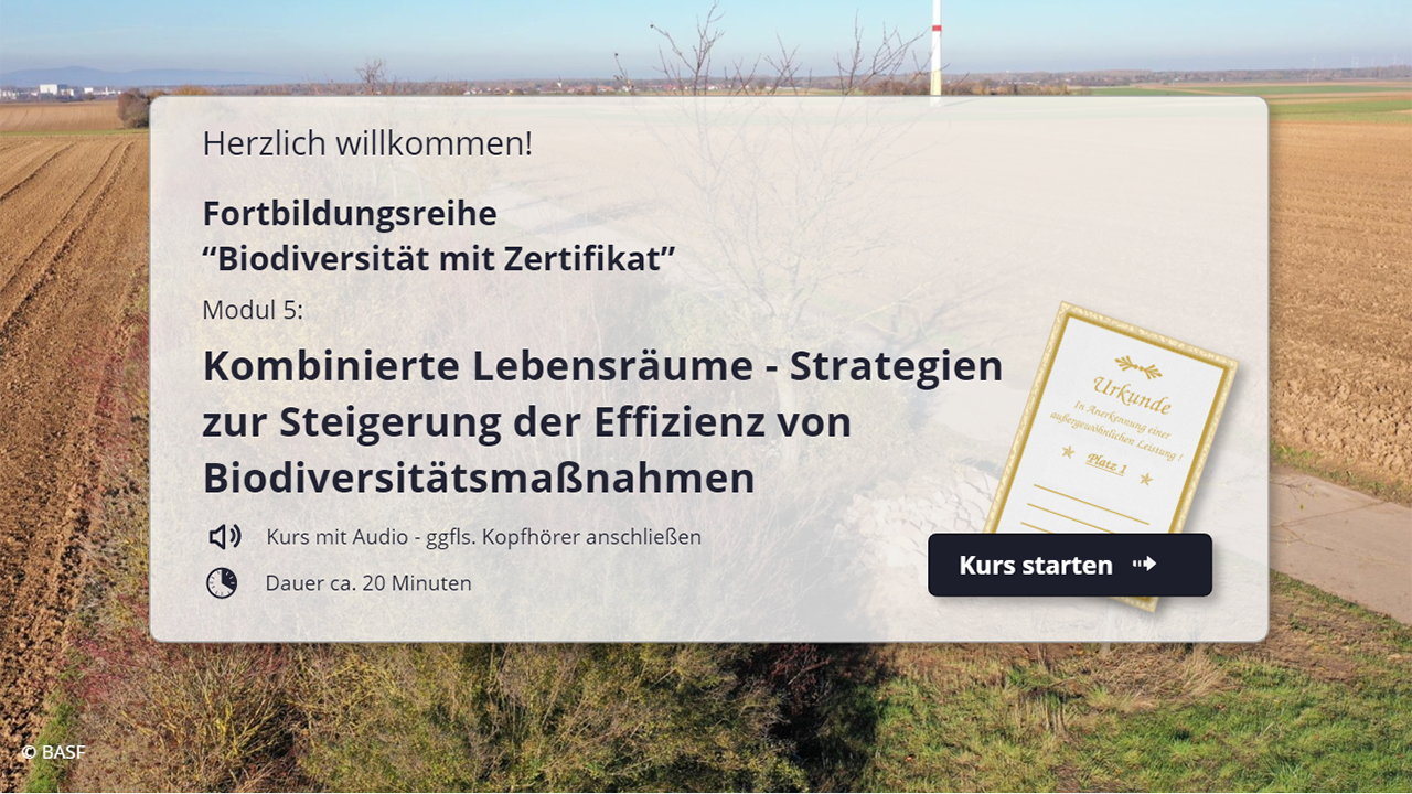 Darauf sind unsere E-Learning-Module zur Biodiversität in der Landwirtschaft ausgerichtet. BASF unterstützt Landwirtinnen und Landwirte bei der Weiterbildung zum Thema Biodiversität. Als erster deutschsprachiger Anbieter können wir Ihnen eine Möglichkeit zur Fortbildung in diesem Format anbieten. Sobald Sie die Module bearbeitet und die Wissenstests bestanden haben, können Sie das jeweilige Biodiversitätszertifikat von BASF bestellen: entweder als digitales PDF oder als hochwertigen Ausdruck per Post – beides für Sie kostenfrei.